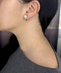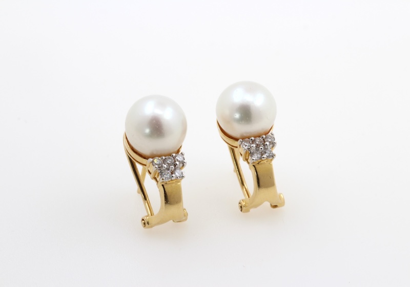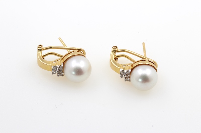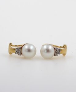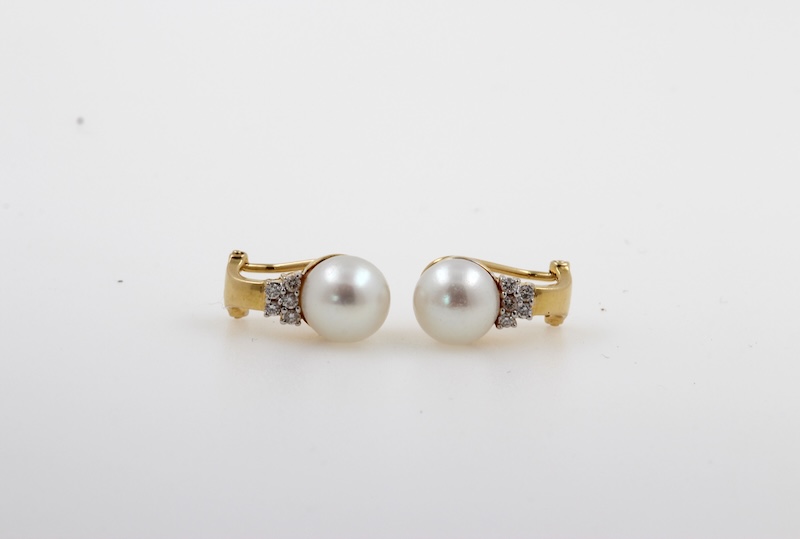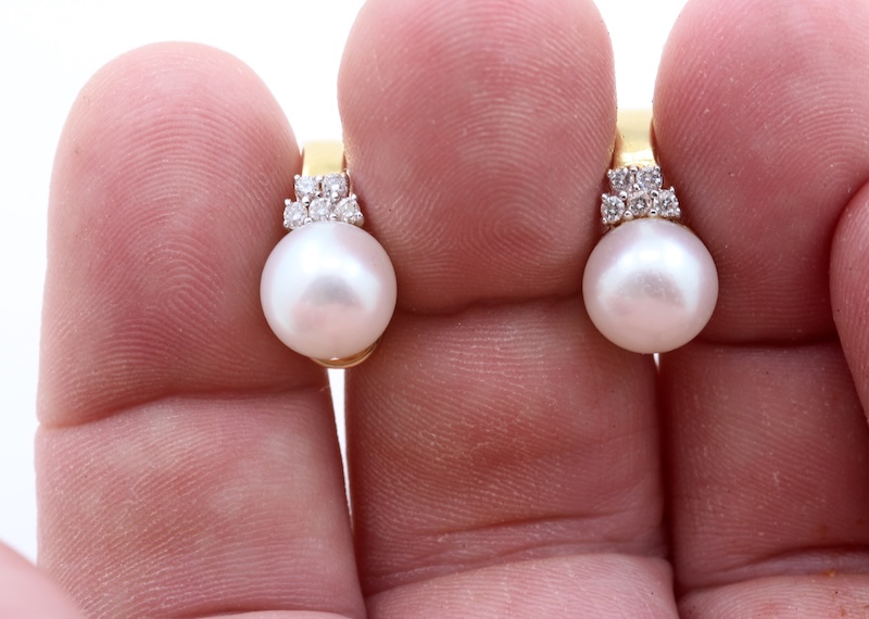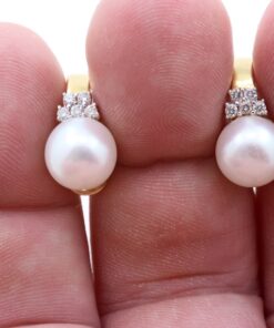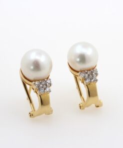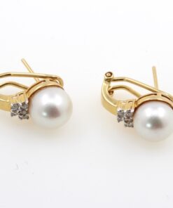 Boucles d’oreilles en or jaune 18 carats ornée de perles de culture de 8,8mm sertie de 5 diamants taille braillant sur chaque boucle