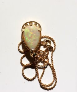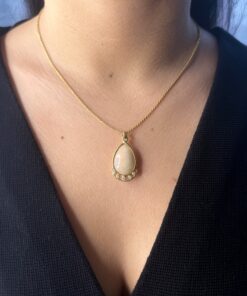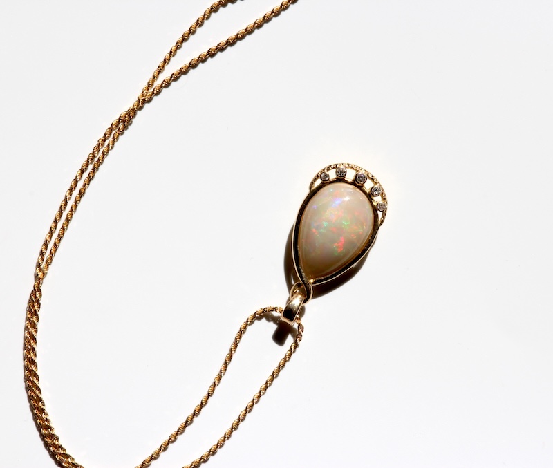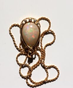 Pendentif Opale naturelle d’Éthiopie dite opale Wello taille poire cabochon d’environ 10 carats avec monture en or 18 carats pavée de 5 diamants hauteur pendentif 3,5cm et chaine maille corde en or 18 carats